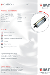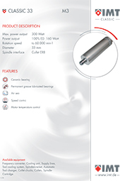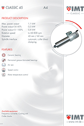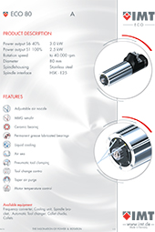 Our home page offers a wide range of our product versatility, such as motorized spindles ranging from 80 Watts to 20 kW complete with the necessary accessories. The modular component structure of the IMT spindles adjusts to nearly every specific high frequency spindle requirement. Along with our extensive produkt range, we also specialize in specifis engineering solutions.